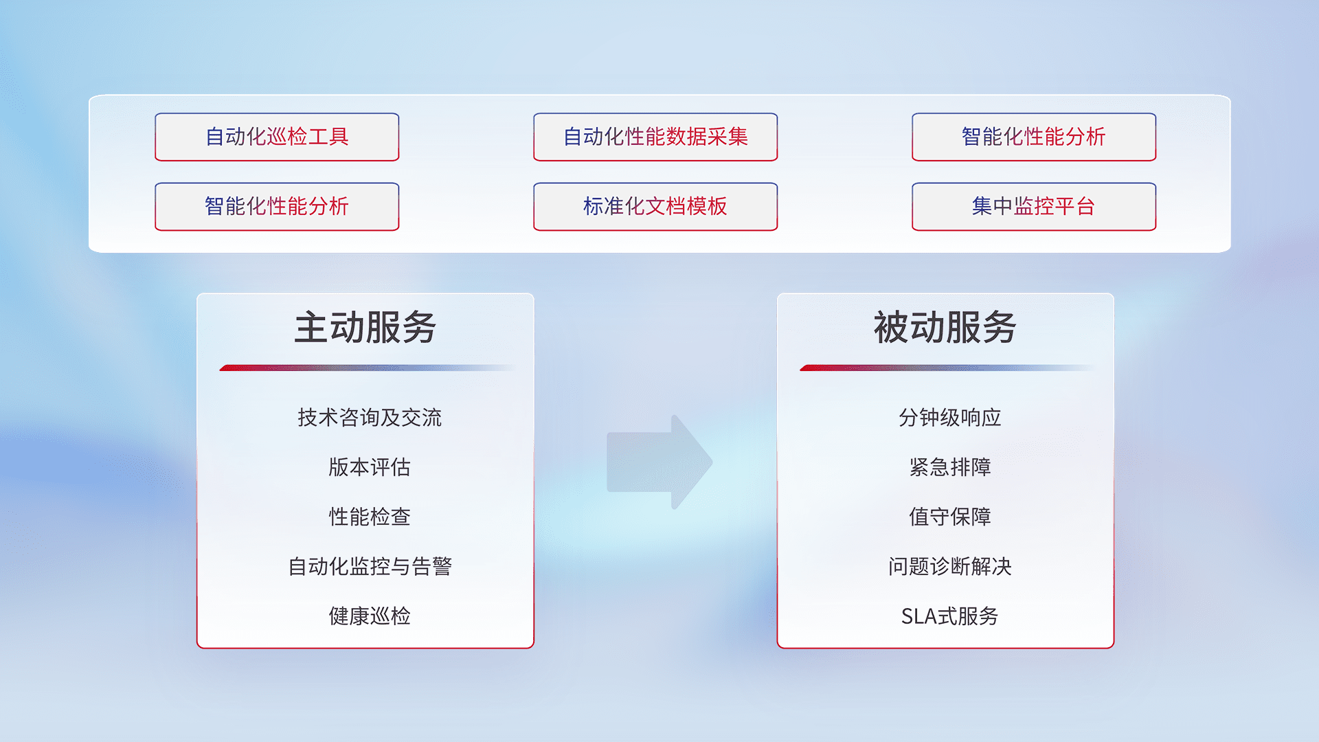 智能化工具和标准化文档,,,保障服务质量,,提供主动服务(包含技术咨询、、、版本评估、、性能检查、、、、自动化监控与告警、、、、健康巡检)和被动服务包含(分钟级响应、、、紧急排障、、、值守保障、、、问题诊断解决、、SLA服务)。。