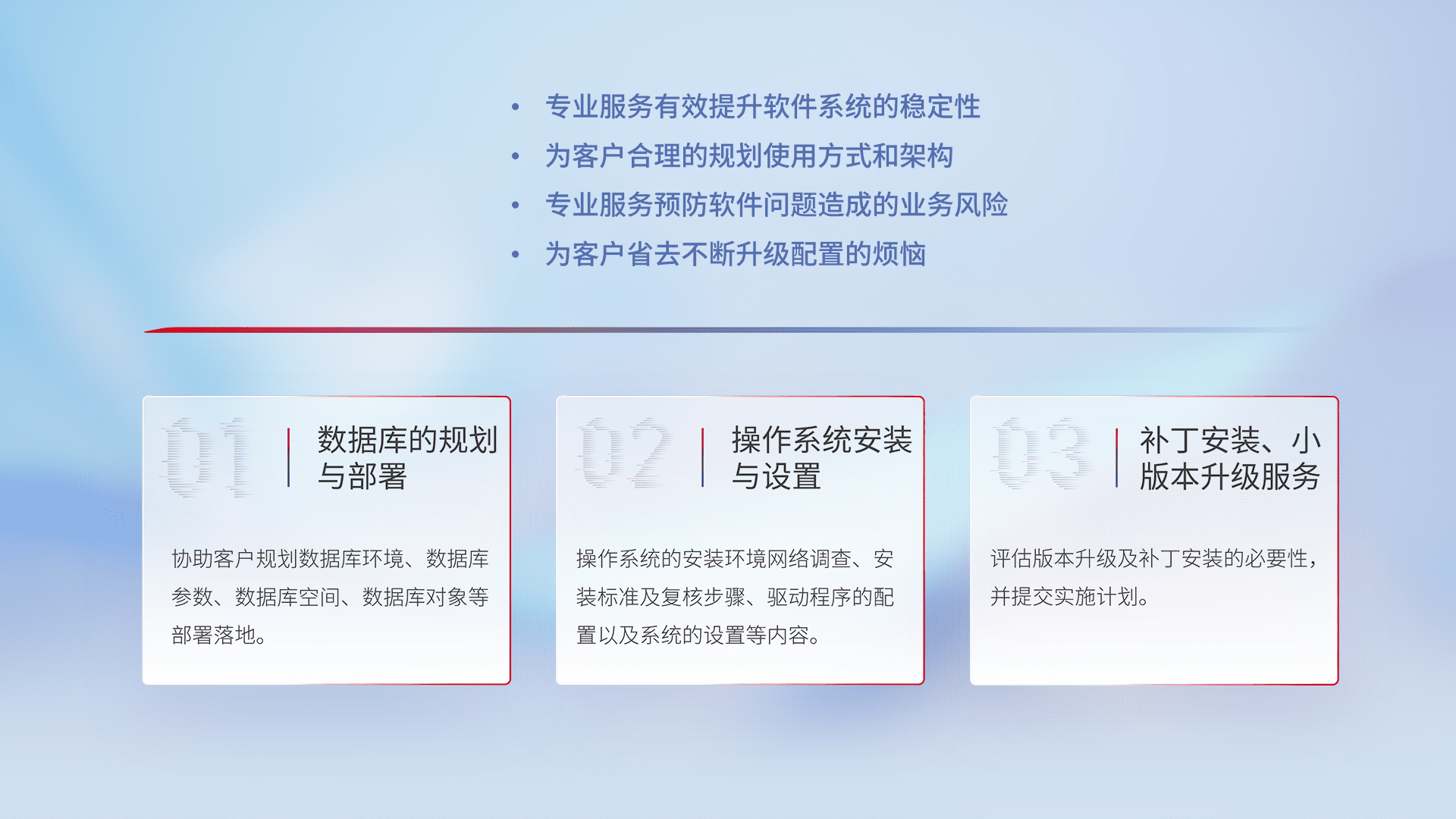 为客户提供软件规模升级、、快速部署、、、按需配置的专业服务,,,从数据库的规划与部署到操作系统的安装与设置,,,,再到补丁安装和小版本升级提供支持。。